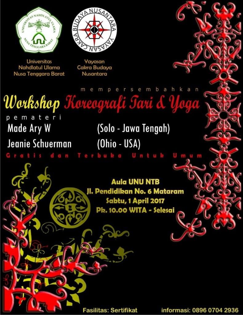 Haloo guys…!!! jangan lupa hadiri “Workshop Koreografi Tari dan Yoga” kerjasama antara UNU NTB dan Yayasan Cakra Budaya Nusantara, dengan Pemateri Made Arya W (Solo – Jawa Tengah) dan Jeanie Schuerman (Ohio – USA), pada Hari Sabtu, 1 April 2017 di Aula UNU NTB… Fasilitas “SERTIFIKAT“, Terbuka untuk umum dan GRATIS…Tanpa dipungut biaya,, Dont’t miss […]
