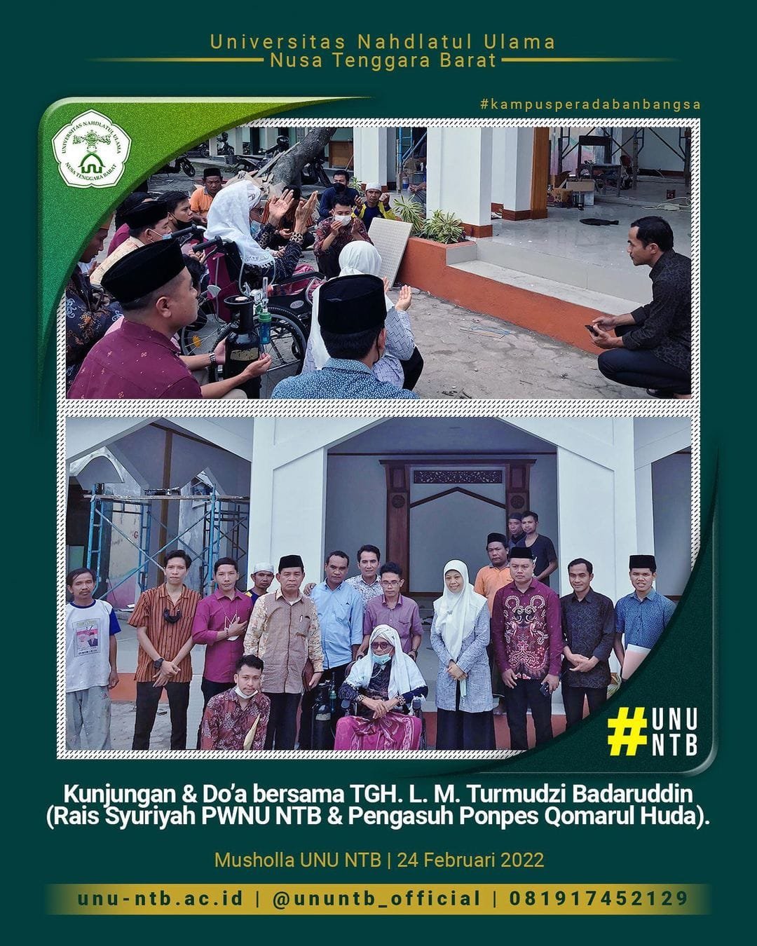 UNU NTB mendapatkan berkah di sore hari ini. TGH. L. M. Turmudzi Badaruddin (Rais Syuriyah PWNU NTB @pwnu_ntb_official & Pengasuh Ponpes Qomarul Huda) berkunjung ke UNU NTB untuk melihat progres pembangunan musholla UNU NTB. Dalam kunjungannya, TGH. L. M. Turmudzi Badaruddin menyampaikan beberapa nasihat serta mengajak untuk berdoa bersama meminta keberkahan bagi pembangunan musholla UNU NTB.