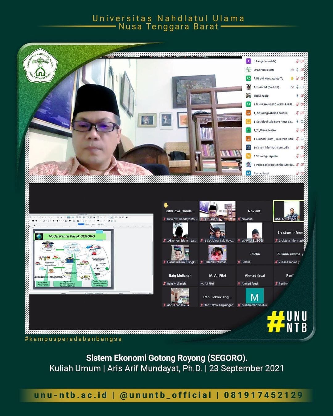 Sistem Ekonomi yang dianut oleh sebuah negara tentunya berdampak besar bagi tingkat kemandirian, perkembangan kemajuan, kesejahteraan & kedaulatan negara tersebut. Berkaitan dengan hal ini, UNU NTB berkesempatan untuk bekerjasama dengan bapak Aris Arif Mundayat, Ph.D. menggelar kuliah umum bertemakan Sistem Ekonomi Gotong Royong atau yang biasa disingkat SEGORO. Kuliah umum yang direncanakan sebagai jalan pembuka bagi pemicu kesadaran & pemahaman tentang sistem ekonomi alternatif ini dilaksanakan secara daring.